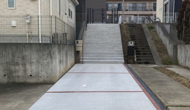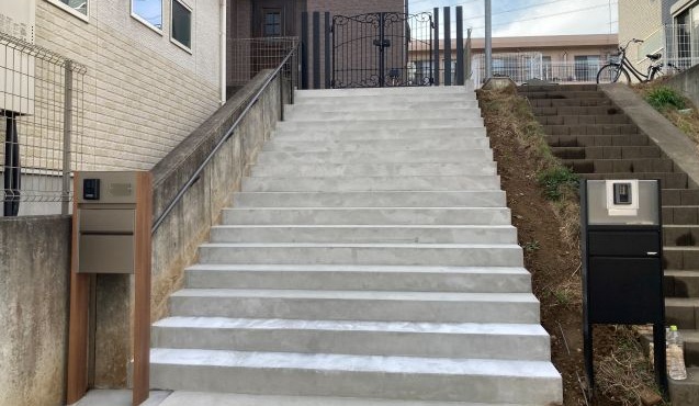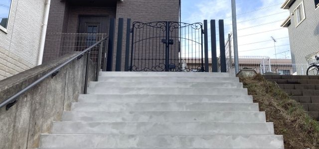 高低差のある階段と鋳物門扉